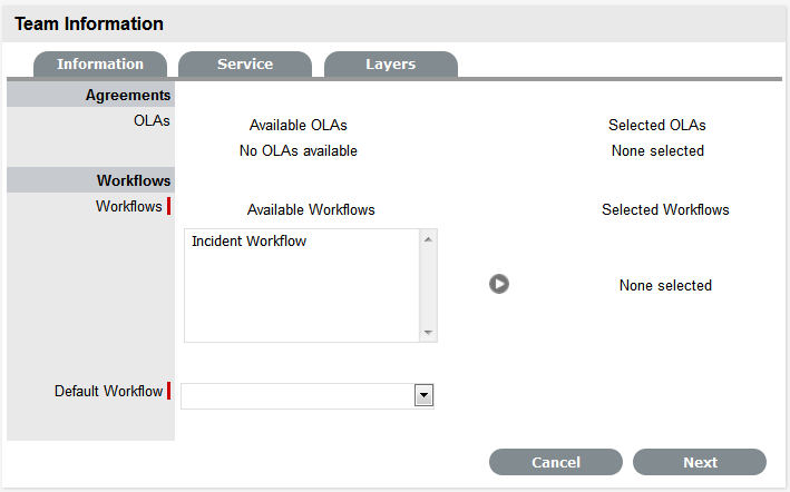 The Information screen moves to the Service tab where the Release Workflows are associated with the Team.