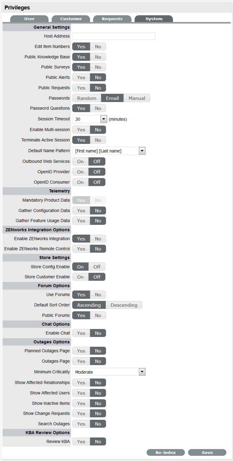 The Privileges tab contains global setup options that govern the application behavior, how Customers and Users can interact with the system and define system defaults.