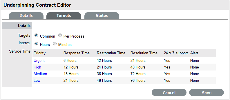 For example, the Urgent default times of 6, 12 and 24, mean 6 hours for the Response stage, 12 hours for Restoration from initial creation, and 24 hours to reach the Resolution from initial service request creation.