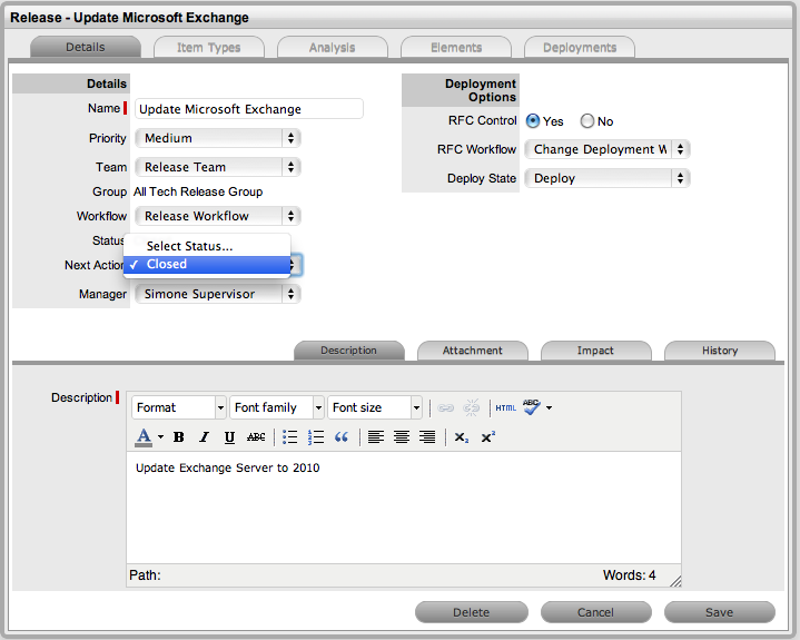 When the Task Status is set to Closed-Resolved, the updated Details contained in the Release will automatically be updated on the relevant Item in the CMDB. The Change Manager can view all Deployment Tasks related to the RFC within the RFC Summary screen, and when all Tasks are moved to Closed-Resolved the Change Manager can close the related RFC. When the Deployment Task is completed, the Deployment within the Change > Deployments tab is automatically closed by the system.