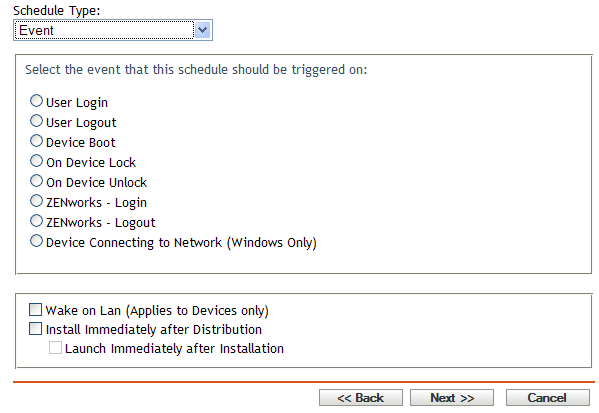 NOTE:At device startup, the ZENworks Adaptive Agent contacts a ZENworks Server according to the device’s refresh schedule to refresh its bundle, policy, configuration, and registration information. If information changes, the Adaptive Agent must refresh its information before the changes can show up on the device, even if one of the event triggers occur. By default, devices refresh randomly between 300 and 360 seconds after device startup with a full refresh every 12 hours.