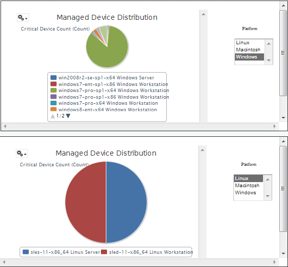 In the dashboard shown below, the same dashboard is used with two different input controls, one with the Windows platform; and the other with the Linux platform. In this example, the number of devices using different versions of Windows and Linux operating systems are shown.