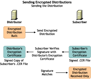 After an encryption certificate has been established on a Subscriber server, the following illustrates the process for sending encrypted Distributions: