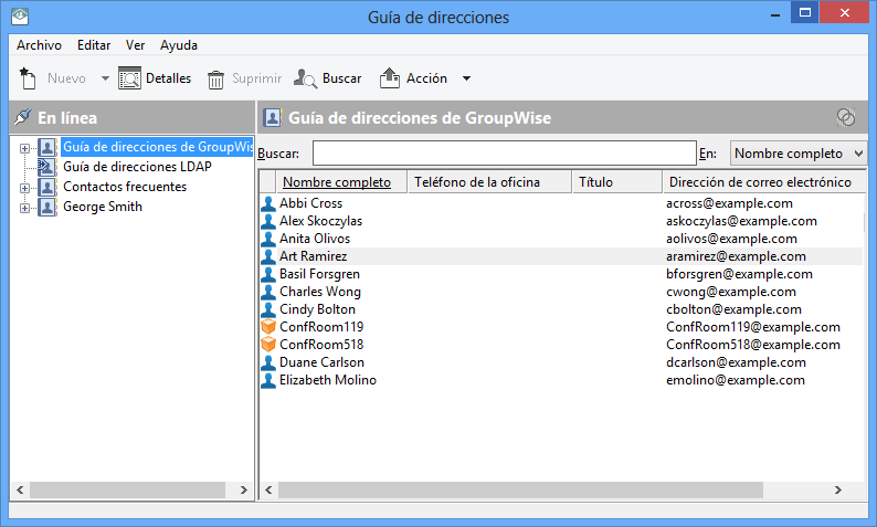 en la barra de herramientas de la ventana principal. El panel izquierdo muestra la guía de direcciones de GroupWise, la guía de direcciones LDAP, la guía de direcciones Contactos frecuentes y cualquier guía de direcciones personales que haya creado.
