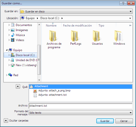 Los elementos guardados se conservan en su buzón y calendario, además de copiarse en la ubicación especificada. Es posible guardar elementos en el disco como archivos de texto, archivos de texto con formato o correo de Internet. Los adjuntos se almacenan en su formato de origen.