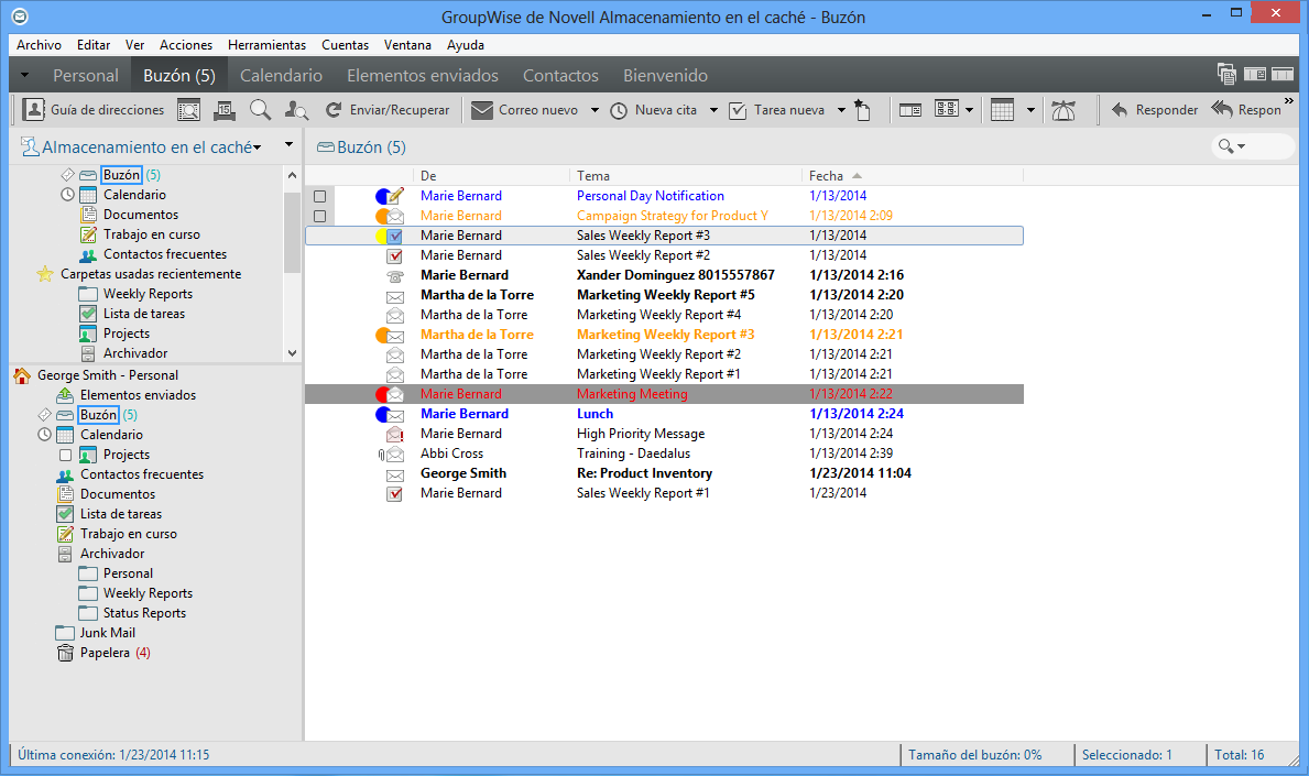 GroupWise almacena todos los mensajes de correo, las citas, y el resto de elementos que reciba en su buzón.