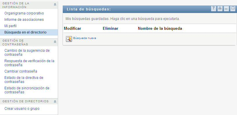 Puede utilizar la página Búsqueda en el Directorio para buscar usuarios, grupos o equipos introduciendo criterios de búsqueda o utilizando criterios de búsqueda guardados previamente.