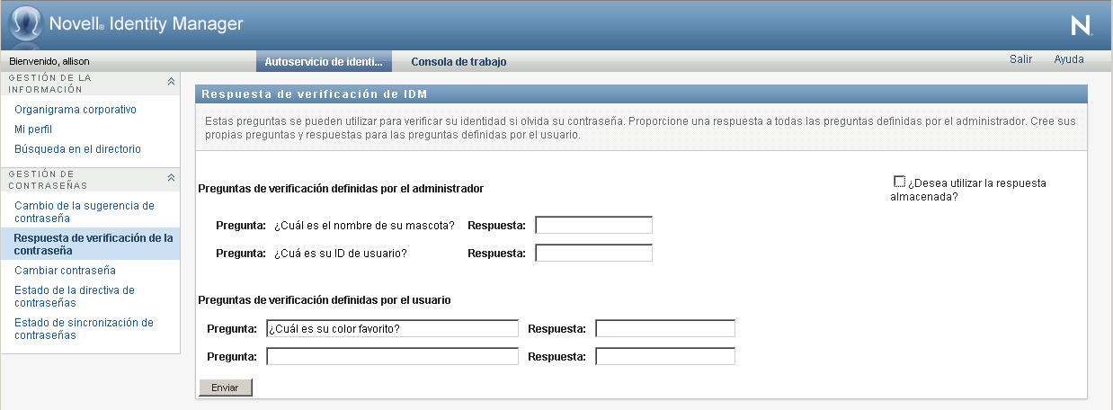 2. Escriba una respuesta adecuada en cada recuadro de texto Respuesta (todos son obligatorios) o utilice la respuesta almacenada previamente. Si el recuadro ¿Desea utilizar la respuesta almacenada? está marcado, las respuestas de verificación no se muestran, incluidas las etiquetas. Además, las preguntas de verificación definidas por el usuario se inhabilitan.