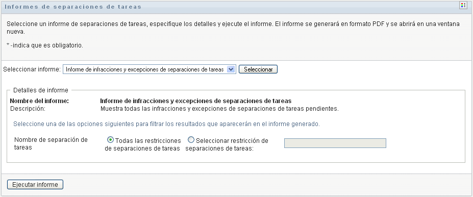 Seleccione para ver todas las infracciones y excepciones pendientes correspondientes a todas las restricciones de separación de tareas. O bien elija para centrar el informe en las infracciones de una única restricción de separación de tareas.