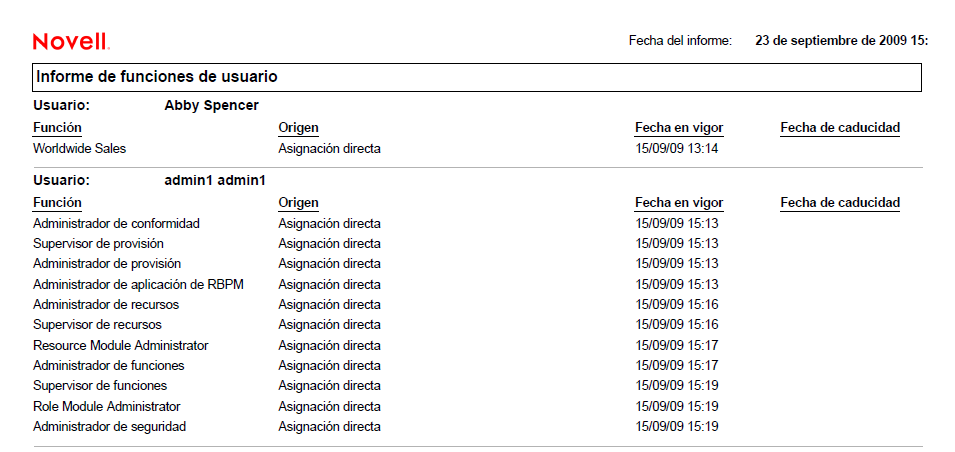 El informe de funciones de usuario muestra las funciones asignadas directamente al usuario seleccionado, si hay alguna. El informe no muestra las funciones heredadas por la pertenencia a un grupo o contenedor.