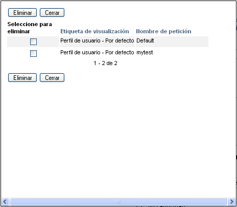 No es posible eliminar ninguna de las definiciones de petición predeterminadas que están instaladas en el producto. Por tanto, las definiciones de petición predeterminadas no mostraran una casilla de selección.