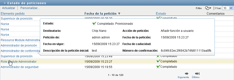 NOTA:si el reloj del sistema del servidor en el que se encuentra el controlador del servicio de funciones no está sincronizado con el reloj del sistema del servidor en el que se ejecuta la aplicación de usuario, el estado de la petición puede mostrarse de forma diferente en las listas Estado de peticiones y Asignaciones de funciones. Por ejemplo, si ha solicitado una asignación de función que no requiere aprobación, puede ver el estado como Aprovisionado en la sección Estado de peticiones, y como Activación pendiente en la sección Asignaciones de funciones. Si espera aproximadamente un minuto, verá como el estado de la sección Asignaciones de funciones cambia a Aprovisionado. Para asegurarse de que el estado se muestra correctamente en todos los componentes de la aplicación de usuario, compruebe los relojes del sistema para asegurarse de que estén sincronizados de forma adecuada.