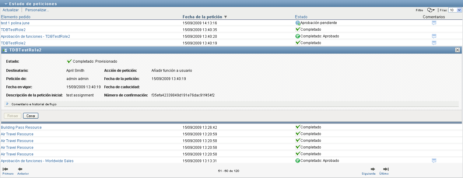 En la lista se incluyen las peticiones activas, las que se han aprobado y las que se han denegado. El administrador puede controlar el tiempo que se conservan los resultados de los flujos de trabajo. El sistema conserva por defecto los resultados del flujo de trabajo durante 120 días.