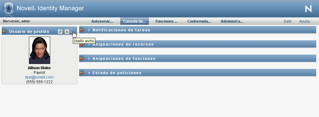 En la sección Perfil de usuario se ocultan los detalles de la entidad seleccionada actualmente para ofrecer más espacio de trabajo para las secciones Notificaciones de tareas, Asignaciones de recursos, Asignaciones de funciones y Estado de peticiones de la página.