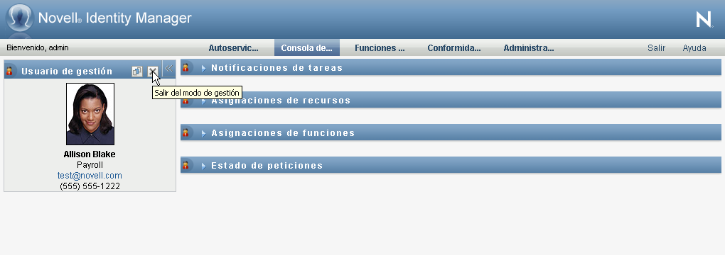 Para salir del modo de gestión y restablecer la Consola de trabajo a fin de que muestre los datos y los permisos de acceso del usuario que ha entrado a la sesión: