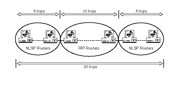 If the diameter of your IPX network is close to the 16-hop limit, you should run NLSP on the routers at the network boundary to ensure continued connectivity across the network as it grows. Figure 13 provides a simple, conceptual view of how this can work.