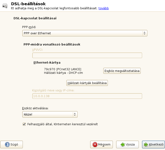 A DSL-beállítás megkezdéséhez (Ábra 20-7) eloször válassza ki a és az , amelyhez a DSL-modem csatlakozik (a legtöbb esetben ez az eth0). Az mezoben adja meg, hogy a DSL-kapcsolatot ki kell-e építeni a rendszerindítási folyamat során. Kattintson a pontra, ha engedélyezni kívánja a normál, root jogosultság nélküli felhasználóknak is, hogy aktiválhassák vagy deaktiválhassák a csatolót a KInternet segítségével.