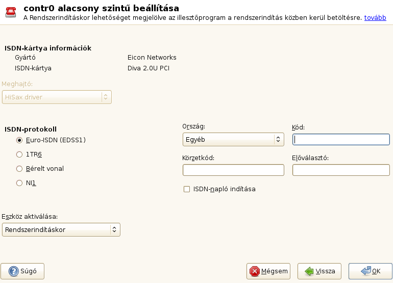 Az határozza meg, hogyan kell az ISDN-csatolót elindítani: a hatására az ISDN-illesztoprogram minden rendszerindításkor inicializálásra kerül. mód esetén az ISDN-illesztoprogramot root felhasználóként kell betölteni az rcisdn start parancs segítségével. A PCMCIA- vagy USB-eszközökhöz használt az eszköz csatlakoztatása után tölti be az illesztoprogramot. Ha minden beállítást megadott, nyomja meg az gombot.