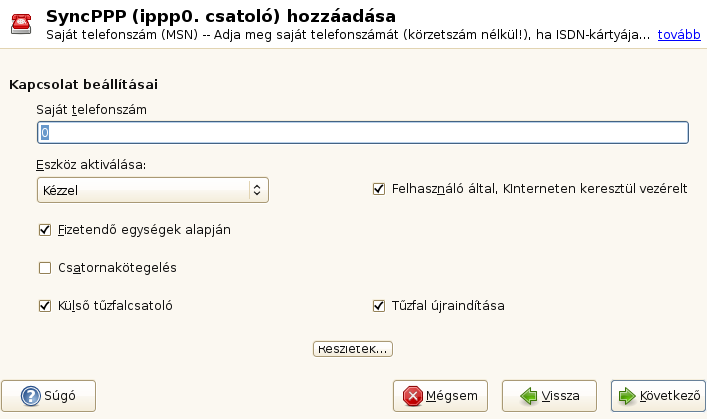Annak érdekében, hogy a kapcsolat a következo fizetési egység elott lebontásra kerüljön, jelölje meg a négyzetet. Ne feledje el, hogy ez nem minden internet-szolgáltatónál muködik. A csatornakötegelés (multilink PPP) is engedélyezheto a megfelelo négyzet megjelölésével. Végül a és a kiválasztásával engedélyezheti a tuzfalat az adott kapcsolaton. Ha engedélyezni kívánja a normál, root jogosultság nélküli felhasználóknak is, hogy aktiválhassák vagy deaktiválhassák a csatolót, akkor jelölje meg a pontot.
