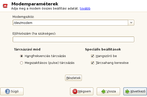 A modem beállítása a YaST vezérloközpont részében érheto el. Ha a modem felismerése nem sikerült automatikusan, akkor nyissa meg a kézi beállításra szolgáló párbeszédablakot a menüpontra kattintással. A csatolót, amelyhez a modem csatlakozik, a részben lehet megadni.