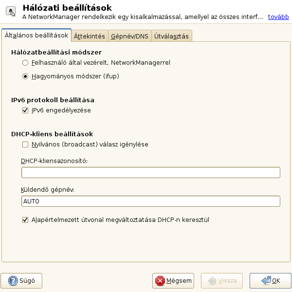 A YaST modul lapján adhatók meg a legfontosabb általános hálózati beállítások, például a NetworkManager használatának engedélyezése, az IPv6- és a DHCP-kliensbeállítások. Ezek a beállítások az összes hálózati csatolóra egyformán vonatkoznak.