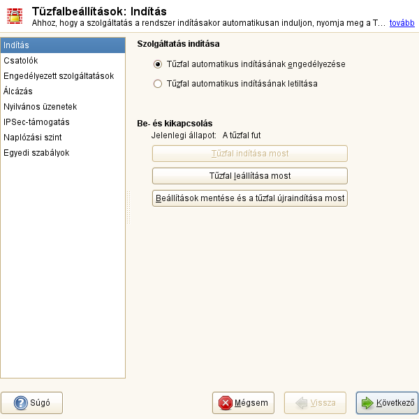 Ebben párbeszédablakban állítható be az indítási viselkedés. Az alapértelmezett telepítés végén a SuSEfirewall2 már fut a frissen telepített rendszeren. Itt indítható el és állítható le a tuzfal. Ha meg kívánja valósítani az új beállításokat a futó tuzfalon, akkor használja a lehetoséget.