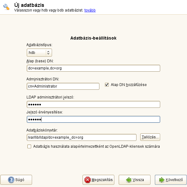Az LDAP-kiszolgáló által kezelt adatbázisok beállítása: