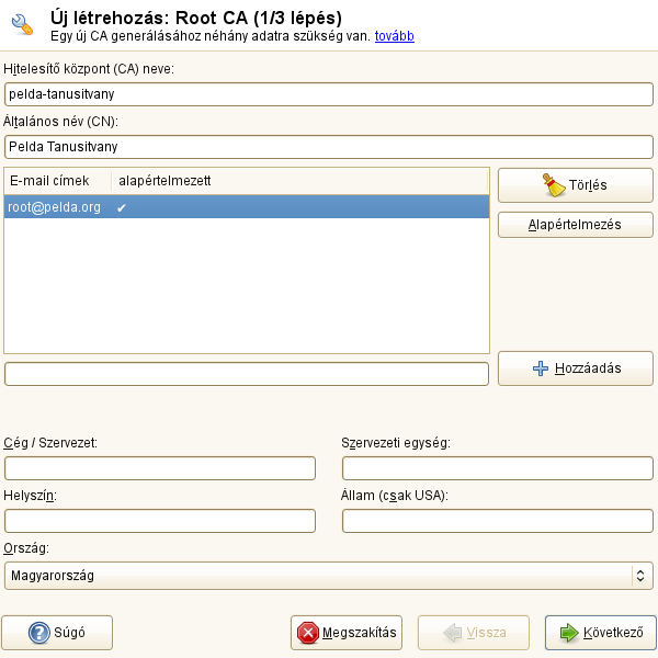 Több elektronikus levélcím is megadható, amelyeket a CA felhasználói láthatnak. Ez hasznos lehet az érdeklodoknek.