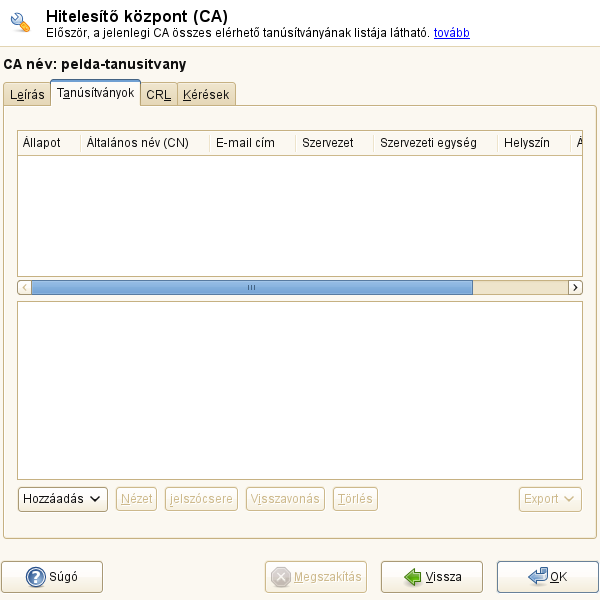 Adja meg a jelszót a második párbeszédablakban. Ez a jelszó mindig szükséges a CA használatakor – alárendelt CA és tanúsítvány készítéséhez. A szövegmezok jelentése a következo: