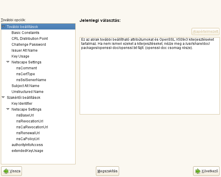 A pontot választva egy párbeszédablak jelenik meg, ahol az X.509 attribútumkiterjesztések adhatók meg (Ábra 35-4). Ezek az értékek megfelelo alapbeállításokat tartalmaznak, és csak akkor változtassa meg, ha valóban tudja, mit csinál.