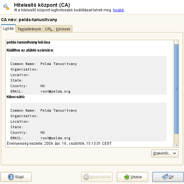 Ne feledje, hogy az érvényességi idotartam nem lehet hosszabb, mint a gyökér CA érvényességi idotartama.