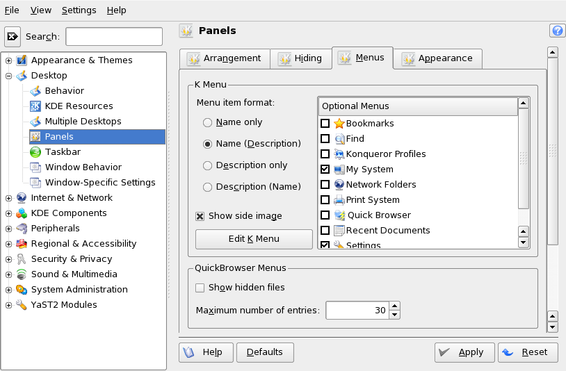 Egy mentétel megváltoztatásához kattintson az pontra. A K Menu Editor program bal oldalon felsorolja a menütételeket.