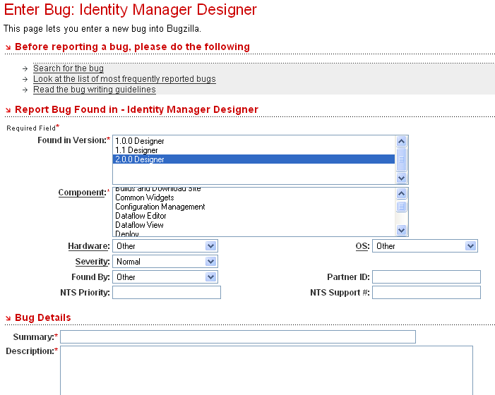 デフォルトで、Designer 2.0製品が選択されています(Designer 1.2はDesigner 2.0 Milestone 3と同一製品です。Designer 1.2はIdentity Manager 3.0 SP1にバンドルされています)。レポート対象のコンポーネントが不明な場合は、分かる範囲でお答えください(Modelerなど)。