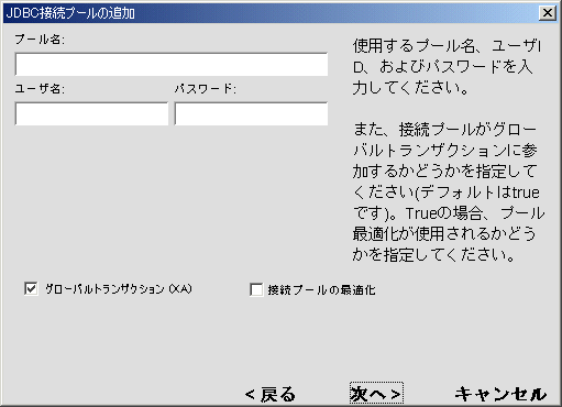 このパネルは、ターゲットデータベースへの接続にサーバで使用するプールの名前およびユーザ名とパスワードの組み合わせを指定するために使用されます。