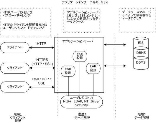 アプリケーションサーバは、ネイティブのUNIXセキュリティとWindows NTおよびLDAPディレクトリに接続するJNDI (Java Naming and Directory Interface)を実装します。