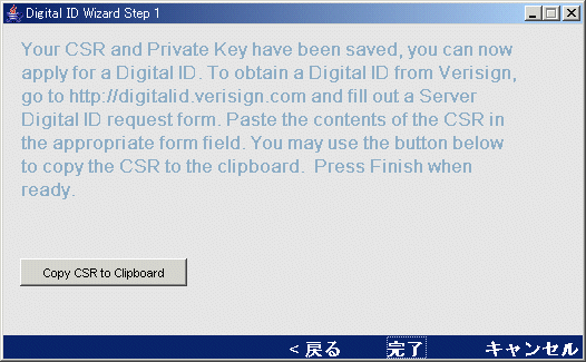 前の手順(クライアント証明書をインストールする - クライアントコンピュータ)でクライアントにより取得されたファイル名を入力して、[完了]をクリックします。