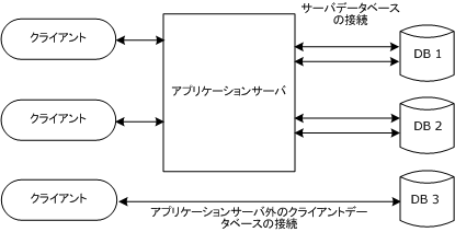 アプリケーションサーバは、クライアントと展開データベース間のすべての接続を処理します。通常、各データベース接続は、JDBCを介してアプリケーションサーバとデータベースサーバの間で確立されるTCP/IP接続です。
