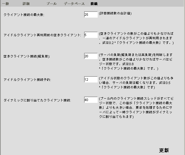 アプリケーションサーバは、合計許容クライアント接続数(スレッド)を制限しています。運用環境でサーバロードを管理するため、この割り当て内で接続パラメータを修正できます。サーバは、個々の接続状況と全体的なロードの観点から、クライアント接続を定義します。