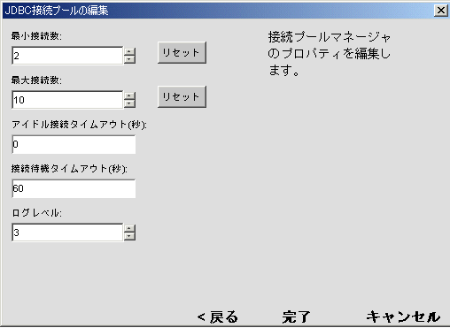 データベースのデフォルト最小接続数。アプリケーションサーバは、起動するとただちにこの数の接続を確立して、サーバが動作している限り、開いたままにします。 注記: データベースがクラッシュして再起動した場合、アプリケーションサーバは古い接続を破棄し、必要に応じて新しい接続を再確立します。最少接続数として指定された接続数はただちに確立されません。 |