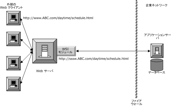 最初の4つの例で、WSIモジュールはURL http://www.ABC.com/daytime/schedule.htmlへのクライアント要求をhttp://sssw.ABC.com/daytime/schedule.html(クライアントのURLアドレスは変わりません)へ転送します。