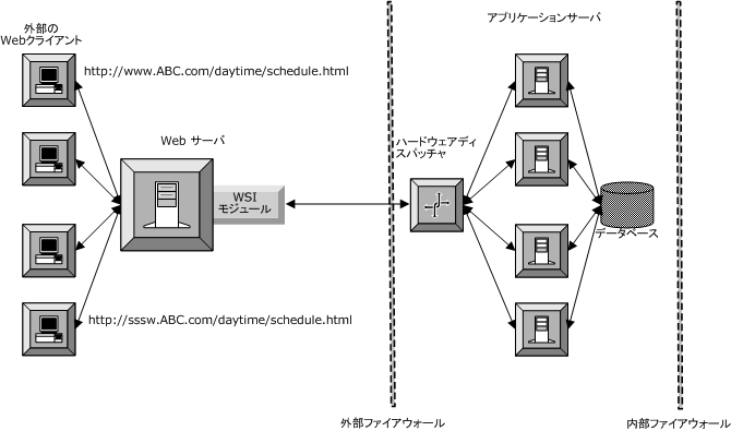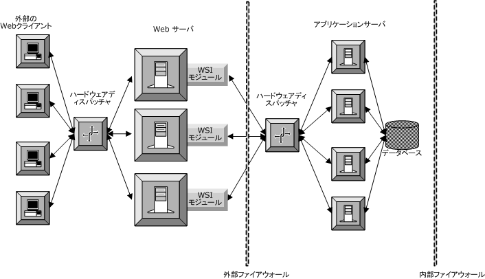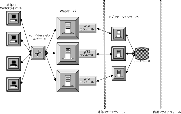 クラスタ化アプリケーションサーバに対しては、WSIでは、ファイアウォールの1つのポートを介してアプリケーションサーバに要求を安全にリダイレクトするため、サードパーティのハードウェアディスパッチャが必要です。