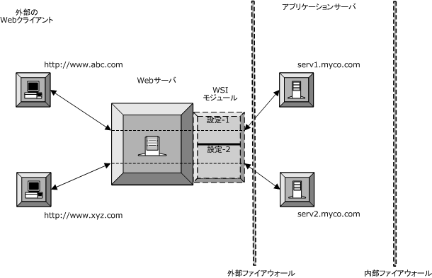 例5: Webサーバと複数のアプリケーションサーバ この例では、WSIモジュールは複数の設定でセットアップされており、着信URLに応じて異なるアプリケーションサーバに要求をルーティングできます。abc.comへの要求はserv1.myco.comに送信され、xyz.comへの要求はserv2.myco.comに送信されます。詳細については、複数アプリケーションサーバへの要求の送信を参照してください。