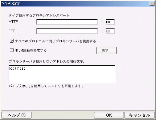 [ツール]>[初期設定]>[デザイナ]ダイアログボックスで[プロキシサーバを使用する]をオンにした場合、詳細なプロキシ設定を入力できます。これらの設定により、HTTPサーバおよびFTPサーバへの接続を確立し、特定のアドレスからはプロキシサーバへのアクセスを不許可にすることができます。