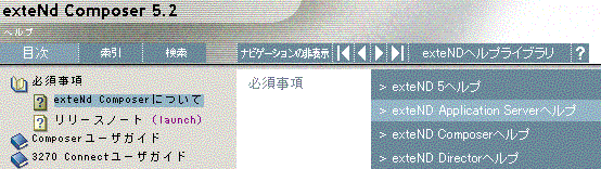 たとえばComposer HTML Connetに関するヘルプを参照中にアプリケーションサーバについて調べるような場合には、いつでも次のような手順で、extendアプリケーションサーバに関するヘルプシステムに切り替えることができます。