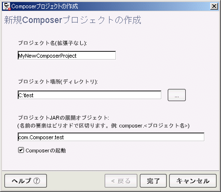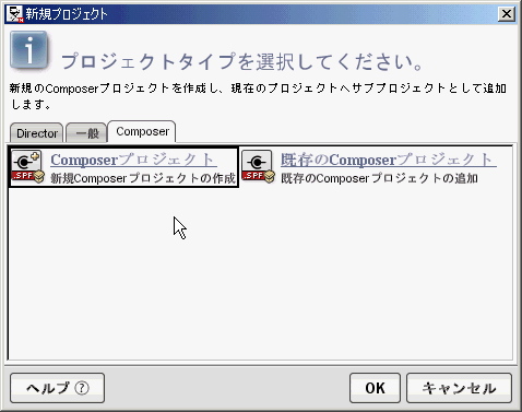 まったく新規にComposerプロジェクトを作成する場合は、[Composerプロジェクト]を選択(クリック)します (現在開いているDirector EAR/WAR/EJB-JARプロジェクトの子プロジェクトになります)。 一方、既存のComposerプロジェクトを開く場合は、[既存のComposerプロジェクト]を選択します。 この場合も自動的に、現在開いているプロジェクトの子プロジェクトとして追加されます。