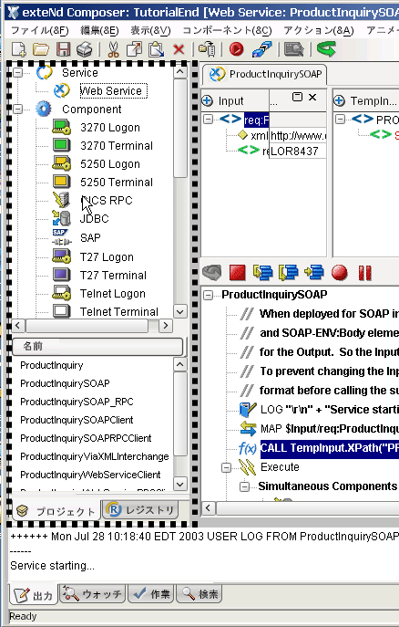 Novell exteNd Composerは、J2EEベースの統合アプリケーションの作成からテスト・デバッグ、パッケージ化に到る工程を強力に支援する設計環境です。 スタンドアローンで動作するモードと、exteNd Directorのサブプロセスとして動作するモードがあります。 以下に解説する機能や開発手法は、どちらのモードでも使えます。