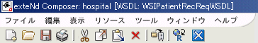 exteNd Composerに外部WSDLがダウンロードされたら、作業コンポーネントを作成するために、WSDLのメッセージパートに対応するXMLテンプレートが通常は必要となります。また、WSDLに対して検証できるXMLサンプルを作成する必要があります(このようなテンプレートは、その後、WS交換で使用されるアクションを作成するためにコンポーネントで使用できます)。この操作は、Composerを使用することにより実行できます。 サービス用のWSDLリソースがあれば、これをそのまま開いてください。 Composerのツールバーやメニューが下の図のように変わり、ボタンをクリックするだけでXMLスタブドキュメント(テンプレートドキュメント)を作成できるようになります。