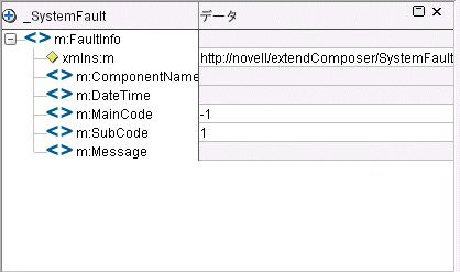障害ドキュメント用のXMLは、普段使っているエディタで作成することもできますが、_SystemFaultという名前でComposerにあらかじめ用意されている、デフォルトのXMLを使っても構いません。 _SystemFaultのXML情報は、ERRORというグローバルオブジェクトにも記述されています。 _SystemFaultドキュメントの構造を次に示します。