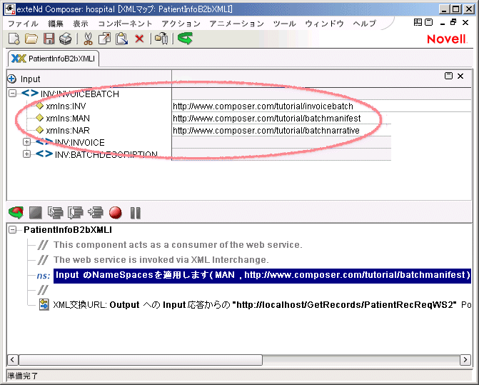 新しく作成したコンポーネントで、その出力メッセージがベースとするXMLテンプレートにネームスペース宣言が含まれている場合、ネームスペースの適用アクションが、自動的にアクションモデルに追加されます。 コンポーネントの実行の際、このアクションにより、適切なルート要素とそのネームスペースプレフィックス、およびルート要素のネームスペース宣言属性が、出力XMLメッセージに埋め込まれます。 このアクションは通常、アクションモデルの先頭に置きます。 さらにこのアクションにより、XMLテンプレートに宣言されていないネームスペース宣言があれば、それも出力メッセージに追加されます。 次の図は、一般的な出力メッセージにネームスペースの宣言アクションを定義する様子を示します。