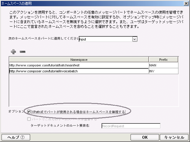 [ターゲットドキュメントのルート要素名]に、ネームスペース宣言属性を記述するルート要素名を指定します。 ターゲットメッセージパートが、スキーマを使って検証可能なXMLテンプレートをベースとしたものであれば、最初から値が入っています。 そうでない場合(たとえば「システム{Any}」の場合)は自分で入力してください。